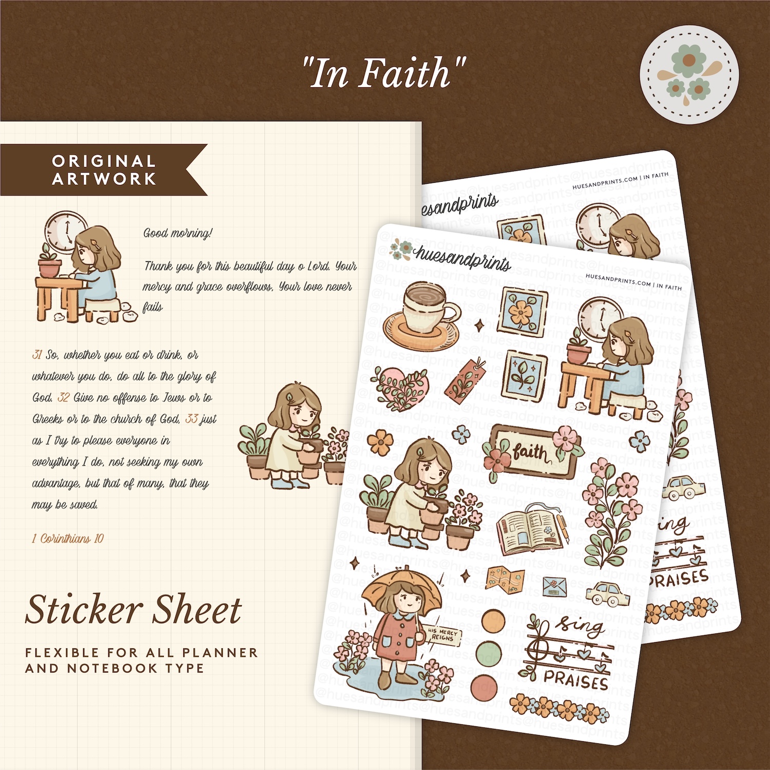 These sticker sheets are carefully designed and drawn with specific themes in mind. “In Faith” is our October 2025 sticker sheet design.